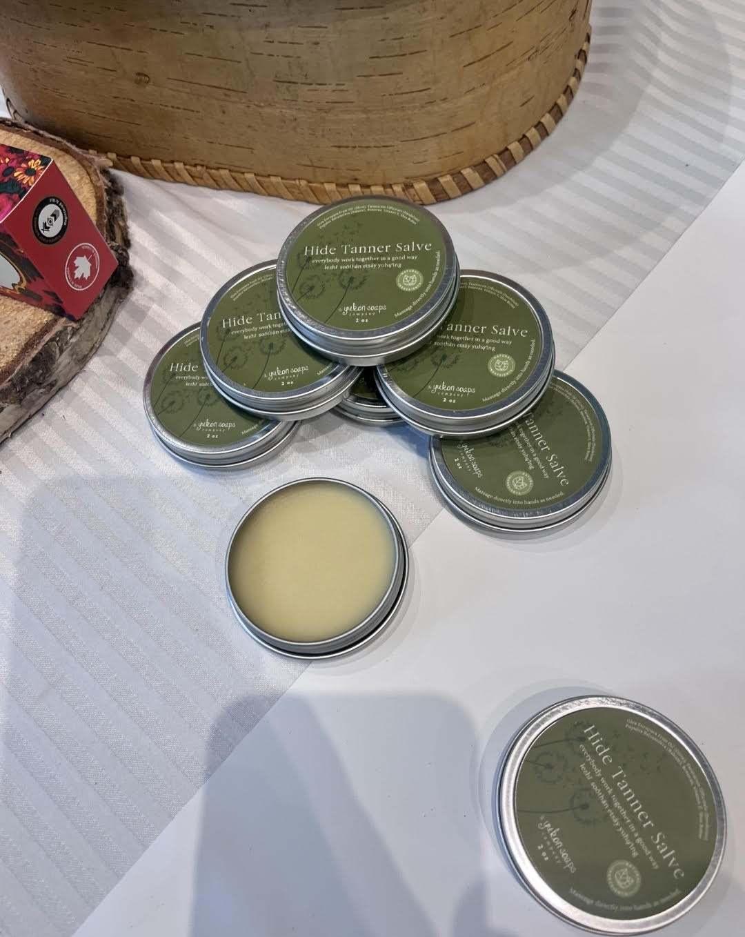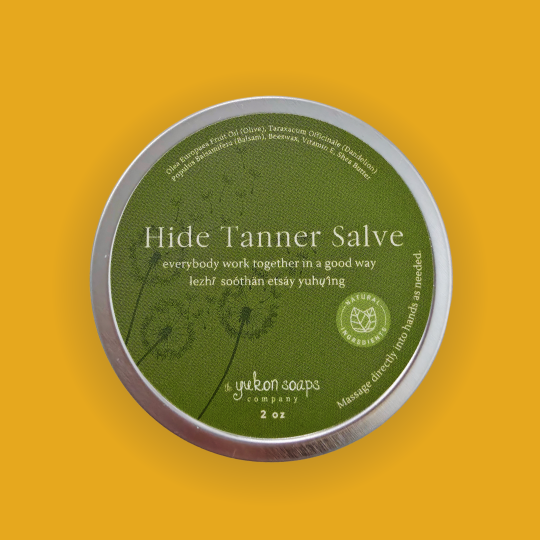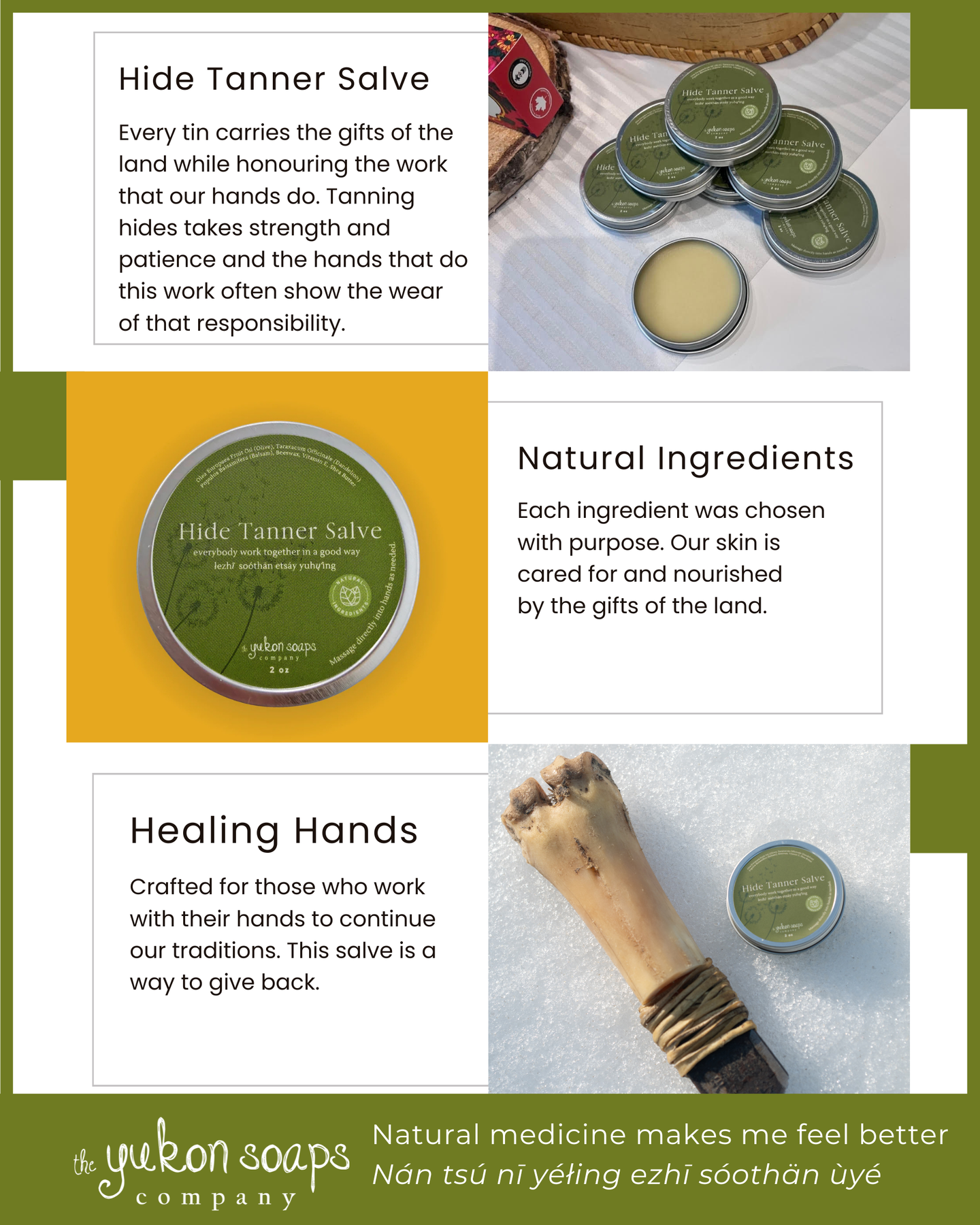 This salve was created with hide tanners in mind, whose hands carry the responsibility of transforming hides into beautiful leather, continuing a practice handed down through generations. Tanning hides takes strength and patience and the hands that do this work often show the wear of that responsibility. This salve is a way to give back to those who are working to keep our traditions alive. With this natural salve, we are reminded that our traditions and our daily work are all connected.